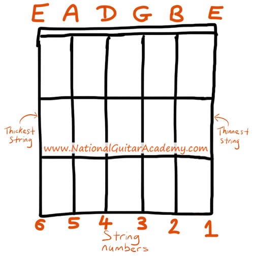 우리의 끈은 가장 얇은 것에서 가장 두꺼운 것까지 1에서 6까지 번호가 매겨져 있습니다. 초보자들에게는 조금 혼란 스럽습니다. 왜냐하면 우리가 말할 때 가장 두꺼운 끈으로 시작하기 때문에 사람들은 그 것을 첫 번째 끈으로 생각하기 때문입니다.
